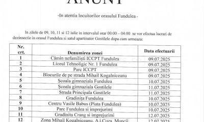 Primăria orașului Fundulea anunță că în perioada 9 – 12 iulie 2025, între orele 00:00 și 04:00 dimineața, se vor desfășura ample lucrări de dezinsecție în...