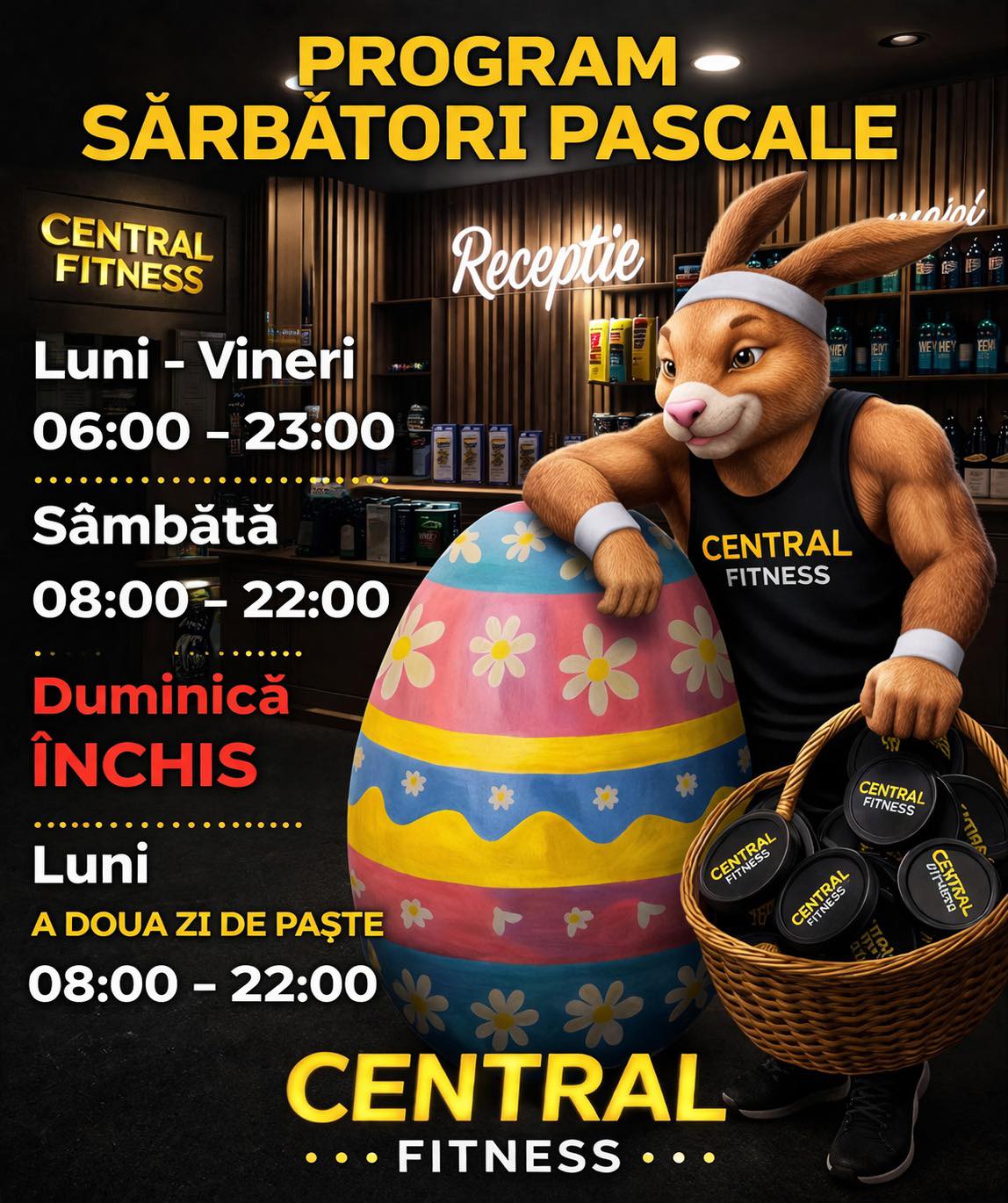 Sala Central Fitness își adaptează programul în perioada sărbătorilor pascale, cu un mesaj clar pentru clienți: antrenamentele continuă, chiar și înainte de masa de Paște.