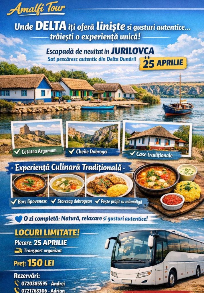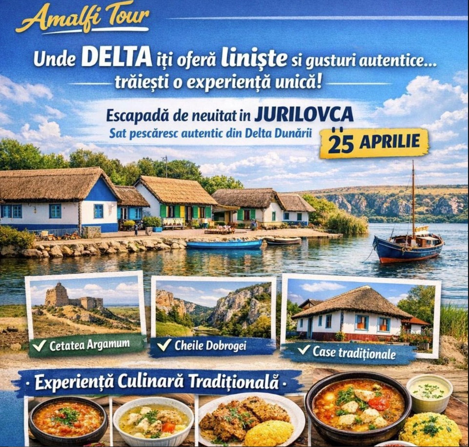 O excursie de o zi în inima Deltei Dunării, la preț accesibil, este propunerea lansată de Amalfi Tour pentru data de 25 aprilie. Destinația: Jurilovca, unul dintre cele mai autentice sate pescărești din Dobrogea, cunoscut pentru liniștea sa, peisajele naturale și gastronomia tradițională.
