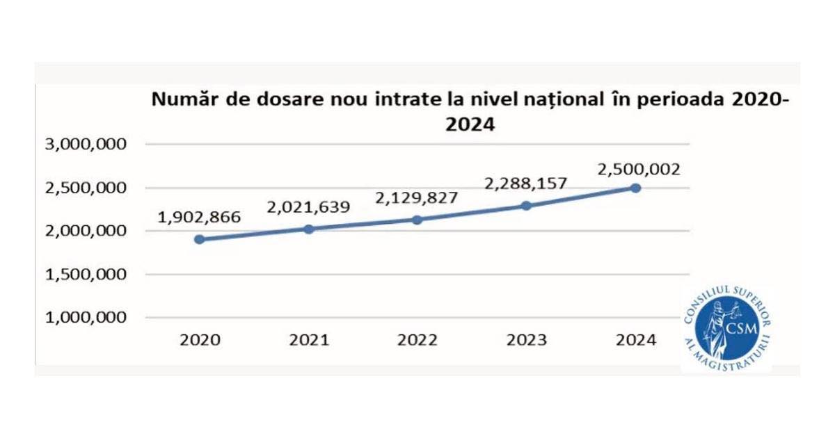 Datele oficiale indică o tendință clar ascendentă în perioada 2020–2024. Dacă în 2020 au fost înregistrate 1.902.866 de dosare noi, numărul acestora a urcat la 2.021.639 în 2021 și 2.129.827 în 2022. Creșterea a continuat și în 2023, când instanțele au preluat 2.288.157 de cauze, pentru ca în 2024 să fie atins pragul de 2.500.002 dosare.