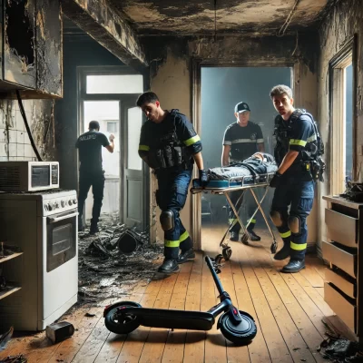 DALL·E 2024-09-12 21.53.50 – A dramatic scene in an apartment showing the aftermath of a fire. Part of the apartment is visibly charred, with smoke damage on the walls, and a burn