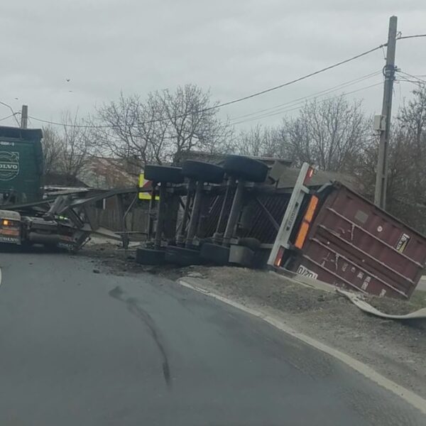 Accident rutier în Lehliu Sat: Încărcătura unui autotren s-a răsturnat într-o curbă