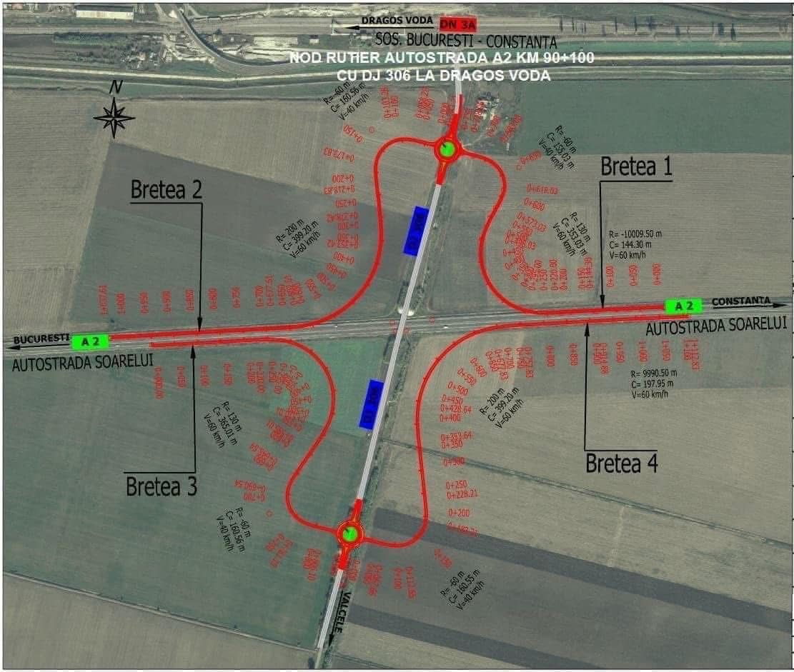 Nodul rutier de pe Autostrada A2, în județul Călărași, va fi construit la kilometrul 90+100, în zona localității Dragoș Vodă Călărași, la intersecția cu DJ306 și DN3A.