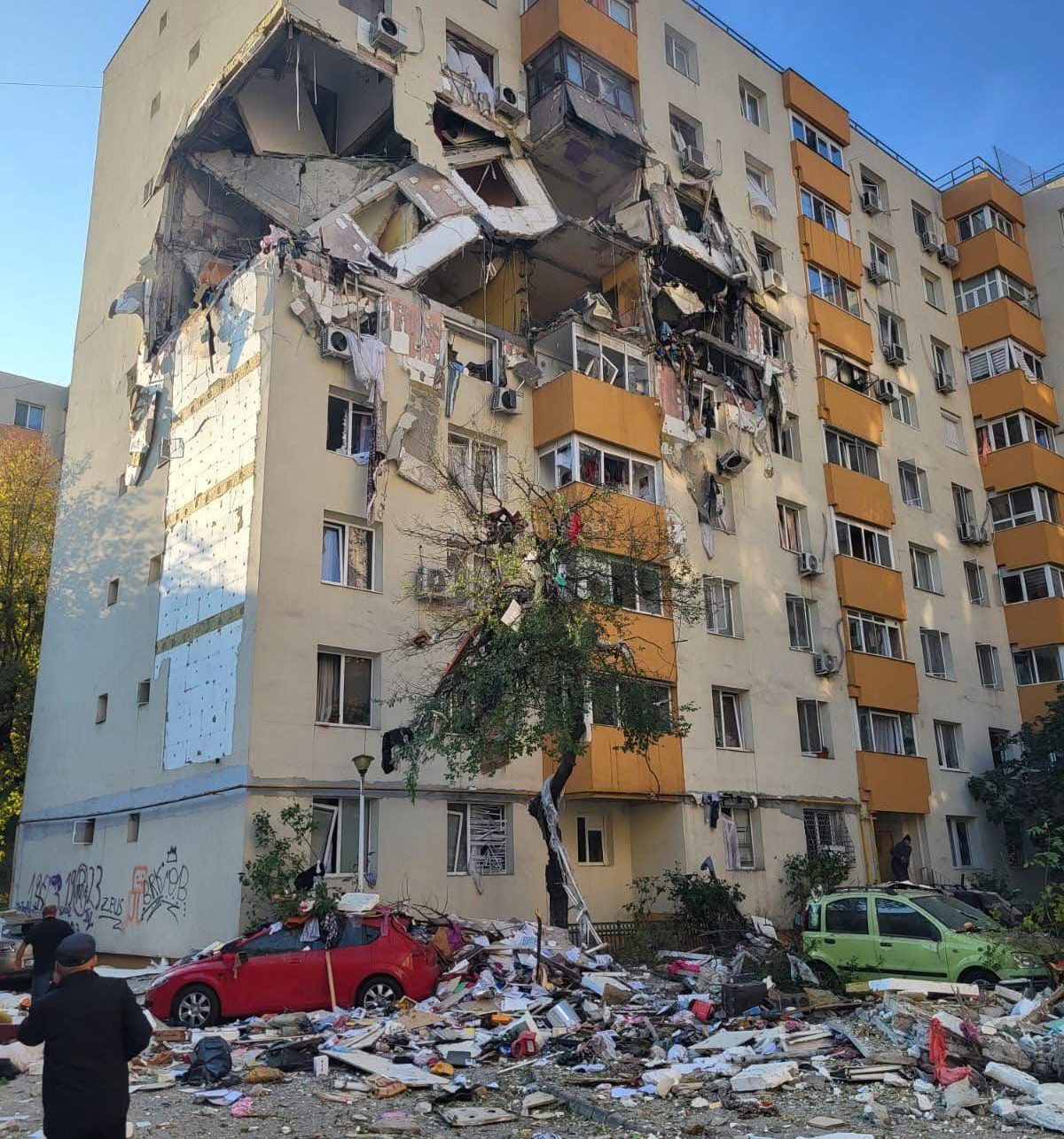 Imaginile surprinse la fața locului arată un peisaj dezastruos: două etaje aproape distruse și apartamente transformate în ruine. Din fericire, explozia nu a fost urmată de incendiu, însă pagubele materiale sunt majore.