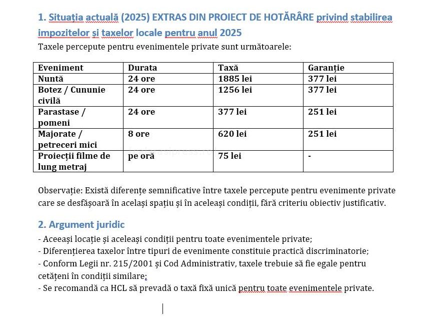 Ceea ce face situația și mai gravă este faptul că inclusiv documentele oficiale recunosc lipsa logicii. În observațiile anexate proiectului de hotărâre se menționează negru pe alb că există „diferențe semnificative între taxele percepute pentru evenimente private care se desfășoară în același spațiu și în aceleași condiții, fără criteriu obiectiv justificativ”.