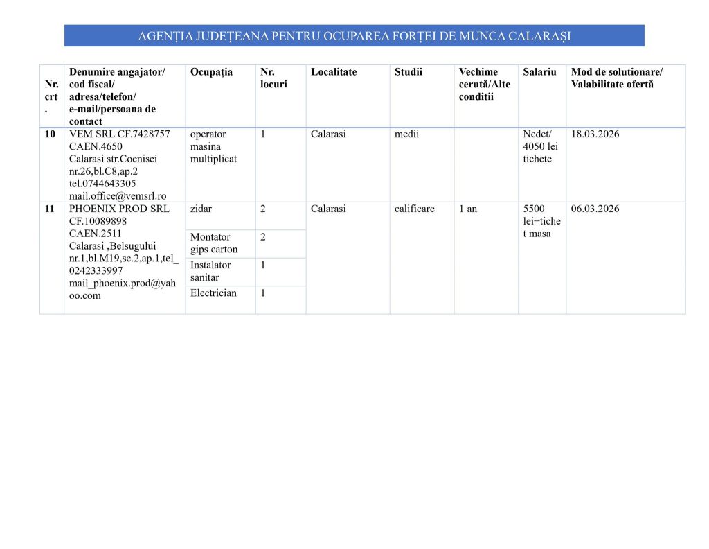 AJOFM Călărași pune la dispoziția persoanelor aflate în căutarea unui loc de muncă peste 90 de posturi vacante în această săptămână. Oferta cuprinde: