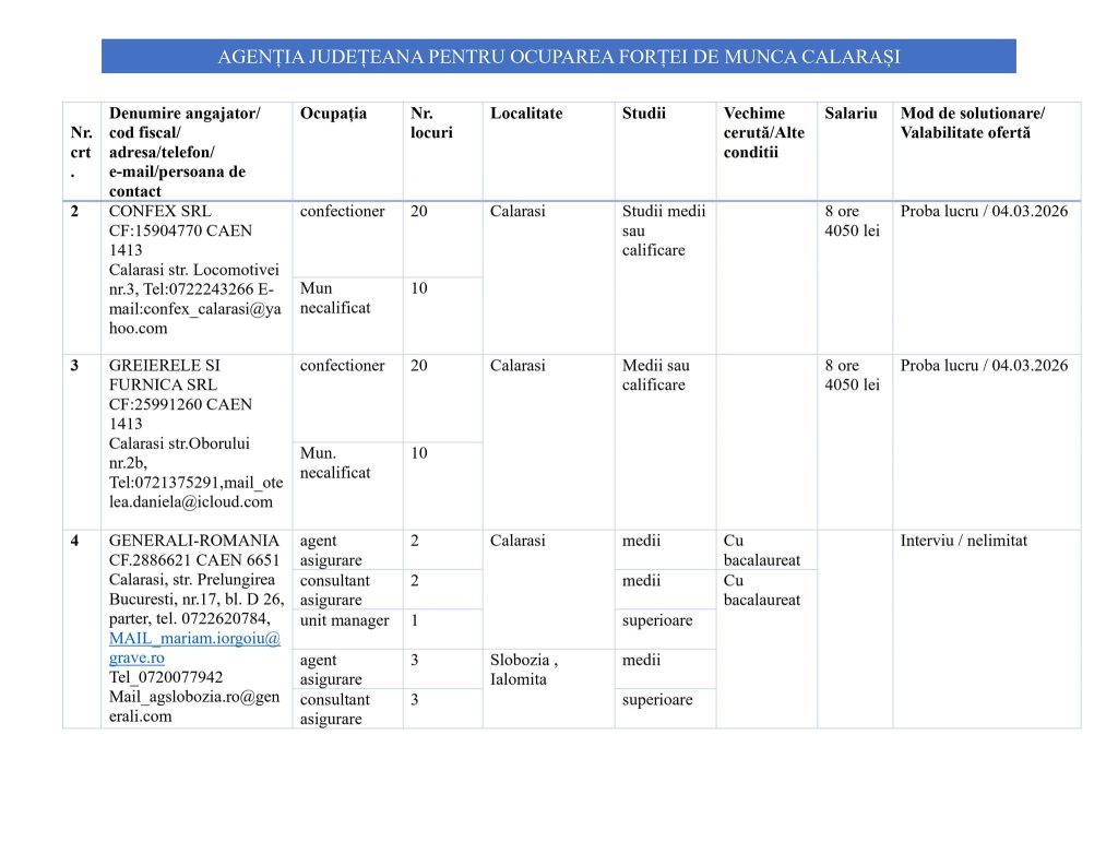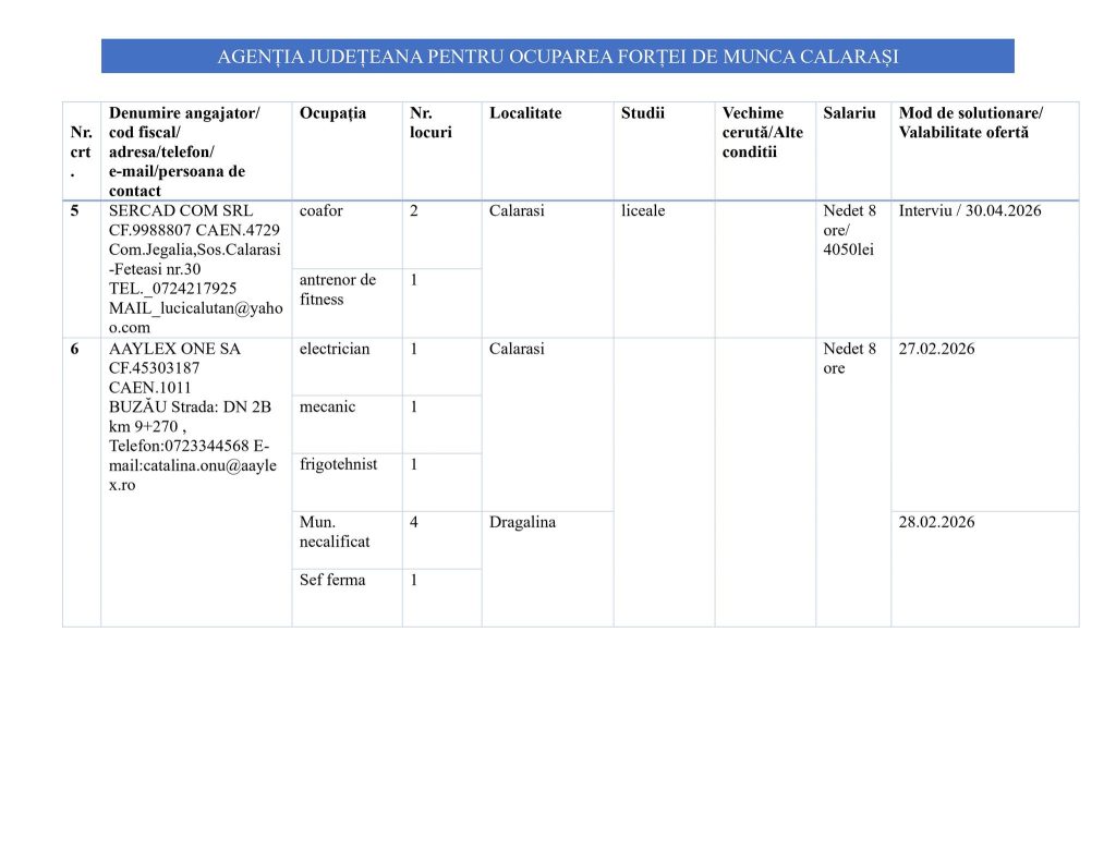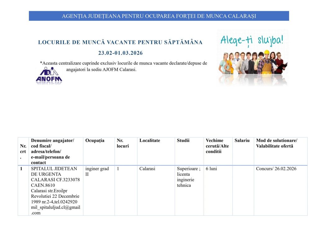 Pentru informații suplimentare privind oferta de locuri de muncă, serviciile de mediere sau consiliere profesională, cei interesați sunt invitați la sediul instituției din Strada 13 Decembrie nr. 12, Călărași. De asemenea, pot solicita detalii telefonic la numărul 0242 318 376
