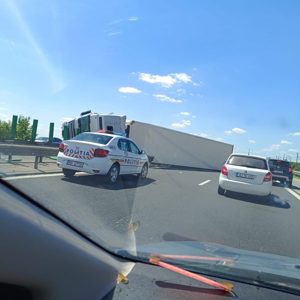 Accident grav pe A2, zona Fundulea. Un tir ucrainean s-a răsturnat după ce a lovit parametrul dintre sensuri