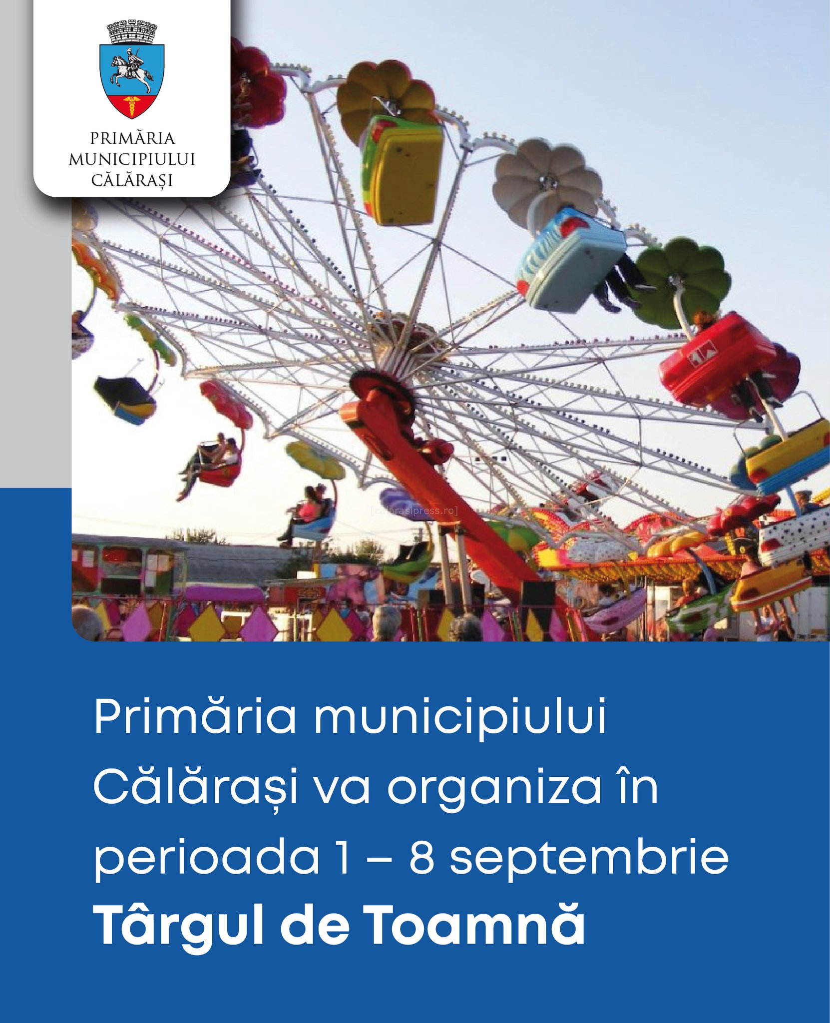 „În perioada 01 – 08 septembrie 2024, Primăria Municipiului Călărași, prin Direcția Municipală de Servicii Publice, organizează ”Târgul de Toamnă 2024”, având ca locație ”Oborul de cereale și animale”, situat în str. Dobrogei.