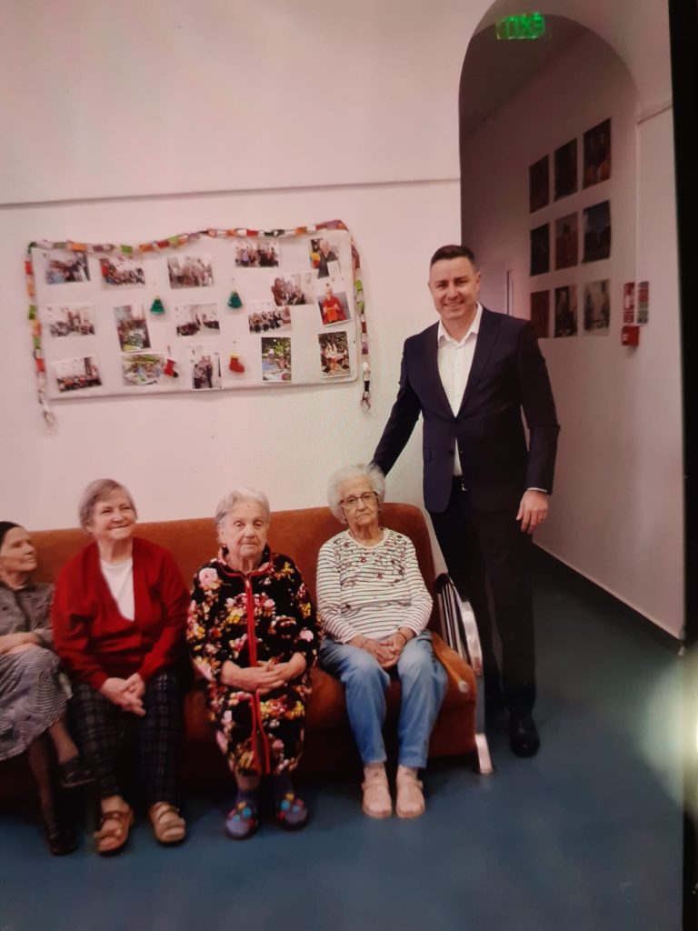 Prima oprire a avut loc la Căminul pentru persoane vârstnice din Oltenița, unde senatorul a stat de vorbă cu seniorii instituționalizați.