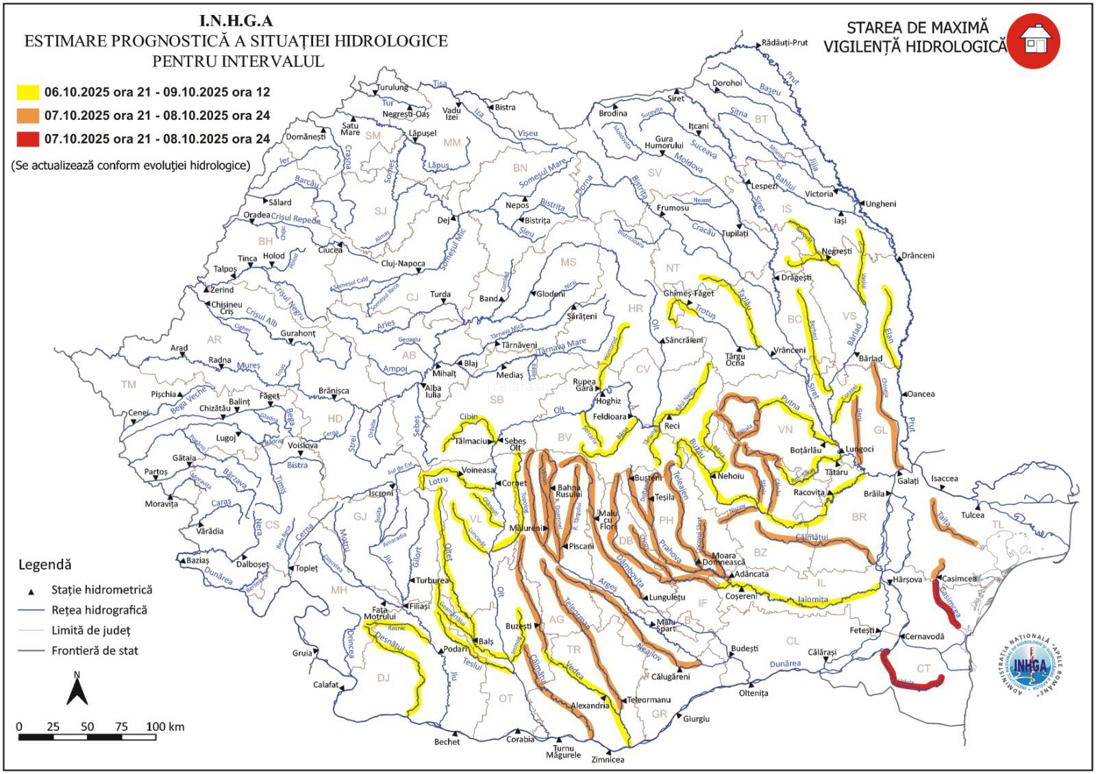 Administrația Națională „Apele Române” a intrat în stare de alertă maximă după ce Institutul Național de Hidrologie și Gospodărire a Apelor (INHGA) a emis o avertizare hidrologică de cod roșu pentru râurile din zona Dobrogei și cod portocaliu pentru mai multe bazine hidrografice din Muntenia și Moldova, în contextul ploilor torențiale prognozate de peste 100 l/mp în următoarele 24 de ore.