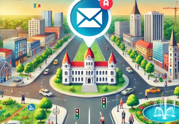 DALL·E 2024-09-11 16.53.35 – A vibrant, modern cityscape of Călărași with elements like roads, sidewalks, parks, and public buildings, highlighted by a large, symbolic envelope ic