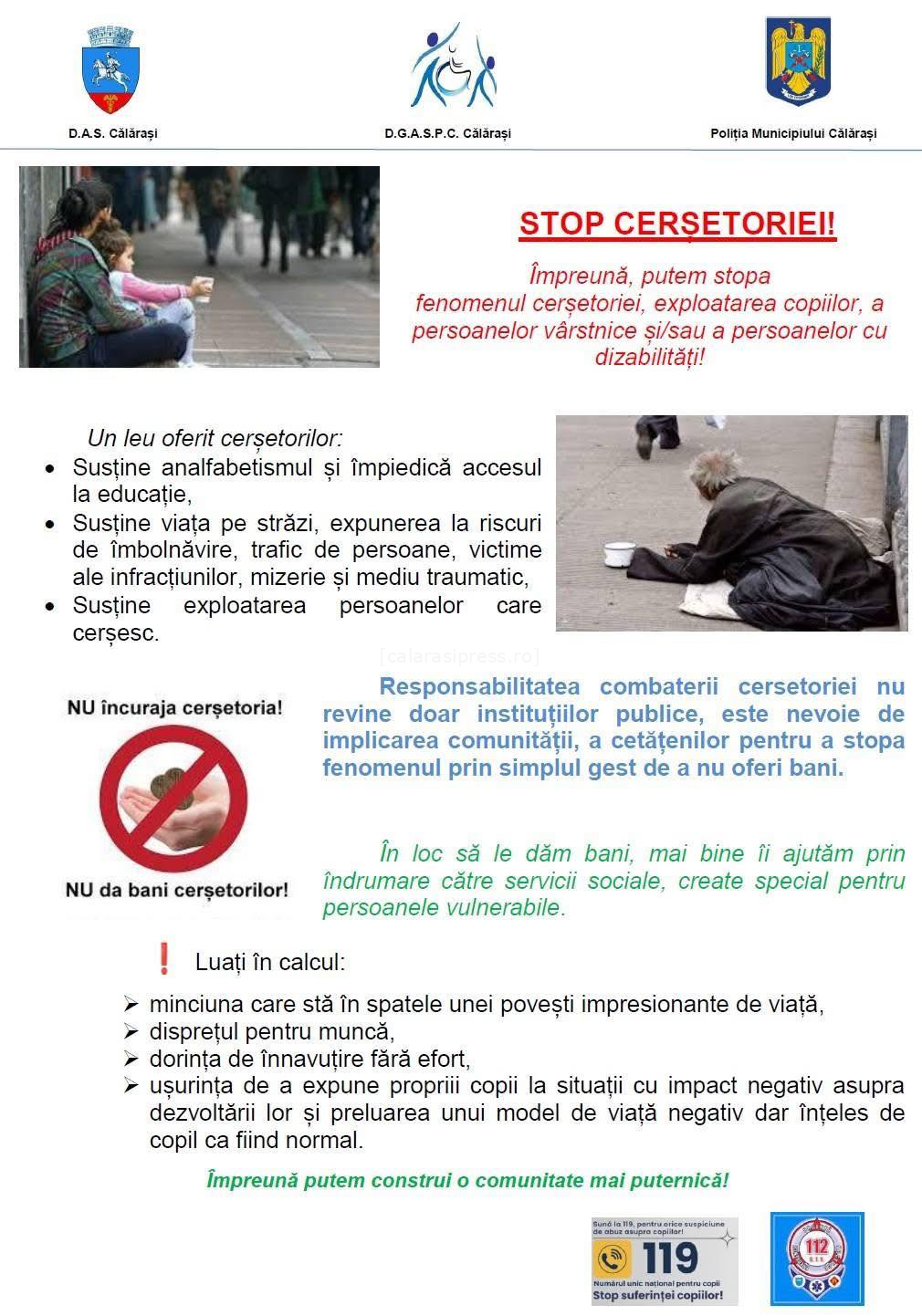 „STOP CERȘETORIEI!” – apel comun al autorităților din Călărași: nu dați bani, îndrumați către servicii sociale