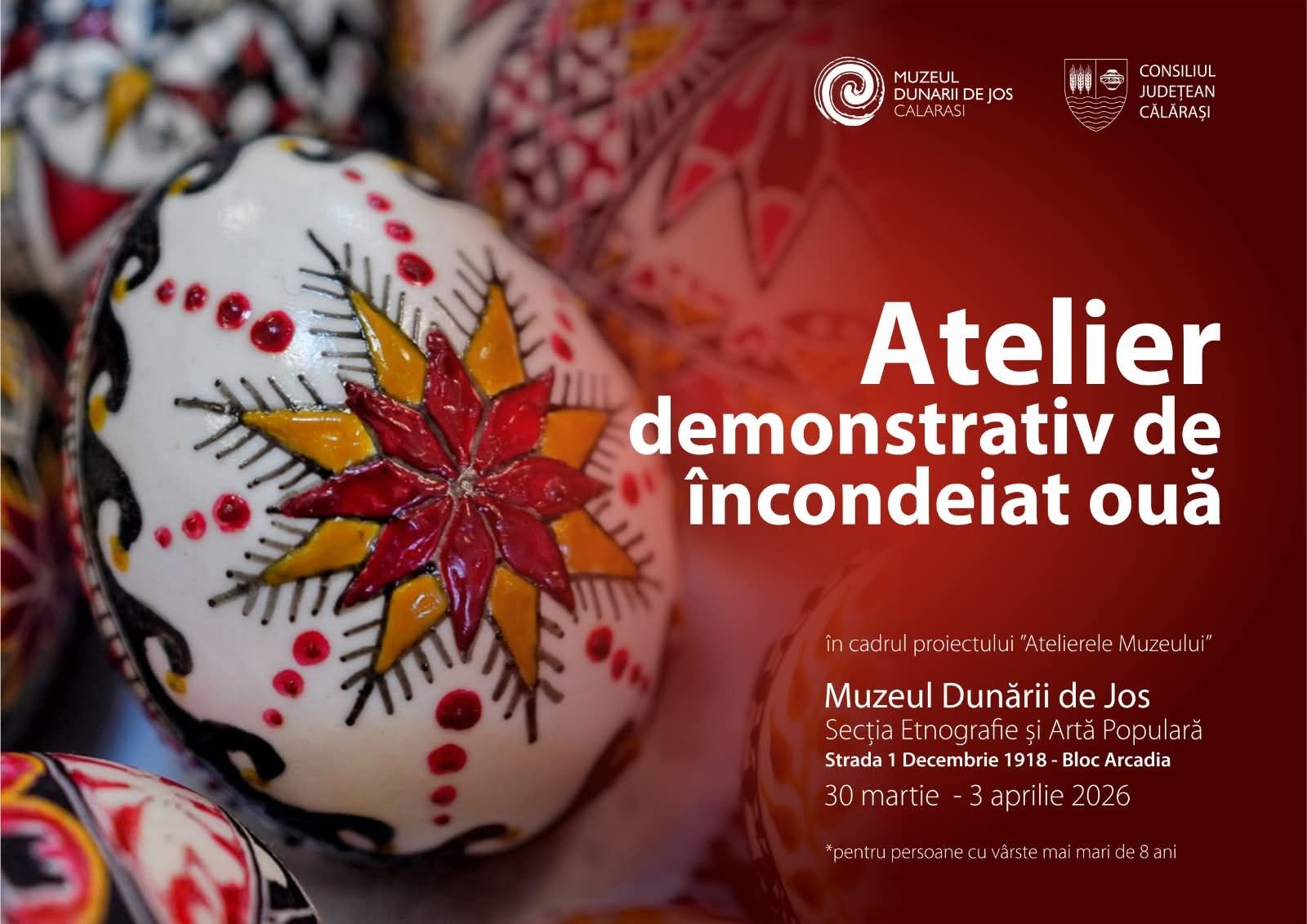 Consiliul Județean Călărași anunță organizarea unui eveniment dedicat tradițiilor pascale, la Muzeul Dunării de Jos. În perioada 30 martie – 3 aprilie 2026, călărășenii sunt invitați să participe la „Atelierele muzeului”, unde vor putea descoperi arta încondeierii ouălor, un obicei specific Bucovinei.