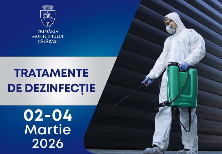 Primăria Municipiului Călărași informează că în perioada 2 – 4 martie 2026, pe domeniul public al orașului vor fi efectuate tratamente de dezinfecție. Intervențiile sunt programate în două intervale orare: 12.00 – 16.00 și 21.00 – 05.00, pentru a acoperi atât zonele intens circulate, cât și spațiile cu risc crescut de contaminare. Autoritățile precizează că desfășurarea lucrărilor depinde de condițiile atmosferice, iar în cazul unei prelungiri, aceasta va fi comunicată ulterior.