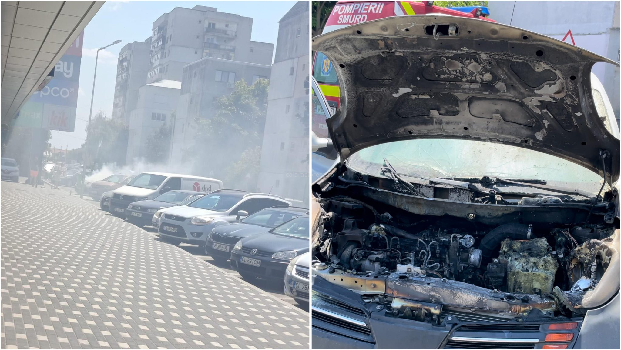 Astăzi, pe strada Locomotivei din Călărași, un autoturism a fost cuprins de flăcări în fața magazinului Pepco. Incidentul a avut loc în jurul orei 13:00, când o femeie care se întorcea de la cumpărături a observat că mașina sa începe să scoată fum de dedesubt.