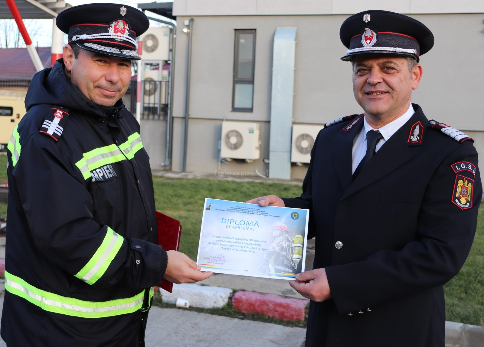 Conducerea Inspectoratului pentru Situații de Urgență „Barbu Știrbei” Călărași i-a mulțumit public pentru întreaga activitate, subliniind rolul important pe care l-a avut în cadrul echipei și în intervențiile desfășurate în sprijinul cetățenilor. La final de carieră, acesta a fost felicitat de colegi și superiori, primind o diplomă de apreciere și o plachetă onorifică, alături de alte gesturi simbolice.