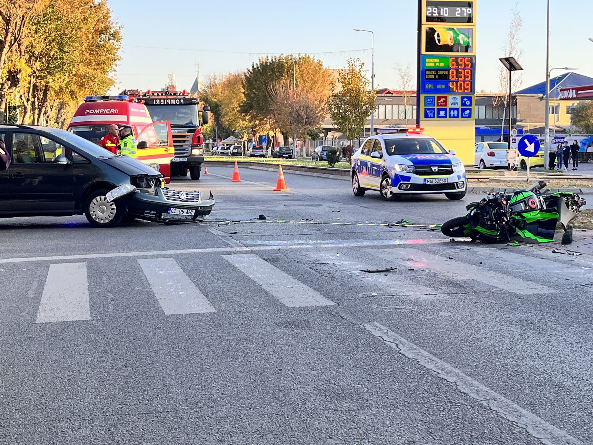 Motociclistul acroșat a fost aruncat de pe motor la o distanța de aproximativ 30 de m de la locul impactului.