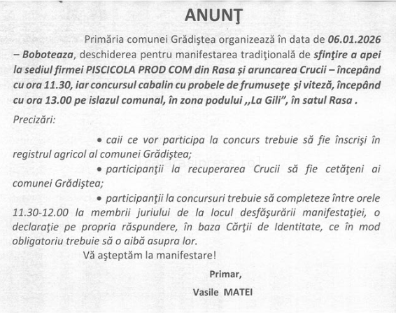 Primăria Comunei Grădiștea anunță organizarea manifestărilor dedicate Bobotezei, marți, 6 ianuarie 2026, un eveniment care îmbină tradiția religioasă cu spiritul comunitar și respectul pentru obiceiurile locale.